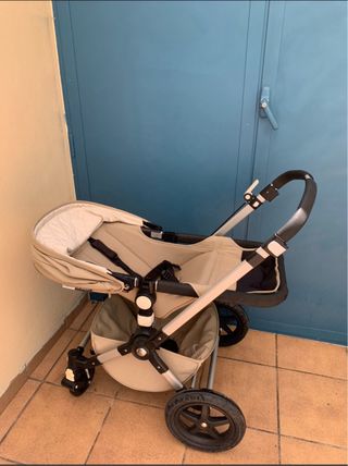Carro de bebé Bugaboo en color gris. Ideal para paseos cómodos. - Estructura metálica. - Arnés de seguridad de 5 puntos. - Barra frontal acolchada. Capota extensible sin estrenar, por ponerle una celeste a juego con las vestiduras en muy buen estado, el capazo se usó tan solo 2 meses en la barra tiene unas fundas protectoras por tener un poco despellejado, por lo demás está muy bien
