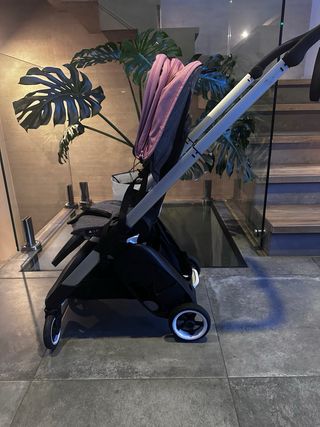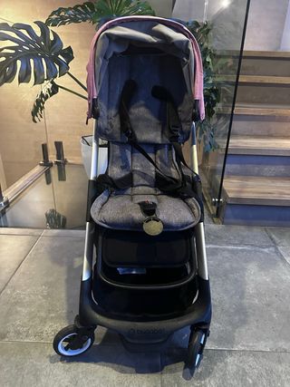 Silla de paseo Bugaboo Ant en color gris y rosa. Es compacta y ligera, ideal para viajar. - Capota extensible en color rosa. - Asiento acolchado. - Arnés de seguridad de 5 puntos. - Cesta de compras. - Ruedas delanteras giratorias. reposapiés de regalo Sin embellecedores laterales