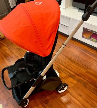 Silla de paseo Bugaboo en color rojo y negro. - Capota extensible. - Arnés de seguridad de 5 puntos. - Asiento acolchado. - Ruedas todoterreno. la capota está un poco decolorada por el sol y el mango de cuero y la barra de la silla están un poco desgastadas del año 2017