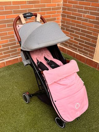 Silla de paseo Bugaboo Fox 1 en color rosa y negro. Ideal para el día a día. - Chasis ligero y maniobrable. - Asiento acolchado y reversible. - Capota extensible. - Arnés de seguridad de 5 puntos.