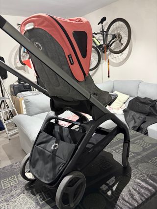 Carro Bugaboo Fox en color gris con capota rosa. - Chasis ligero y maniobrable. - Ruedas todoterreno. - Asiento ergonómico. - Capota extensible para mayor protección solar.
