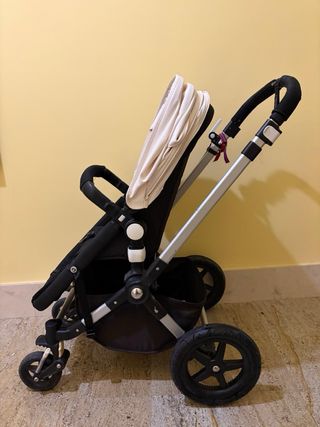 Capazo y silleta Bugaboo Camaleón 3, como nueva como se puede ver en las fotos, usada muy poco tiempo. Capota extensible, funda de piel de repuesto sin estrenar del apoyabrazos. Incluida conchoneta beige para la silleta , redecilla antimosquitos y plástico de lluvia. Esta muy cuidada e impecable. La vendo por necesitar un carro doble. El chasis no tiene arañazos ni roces.