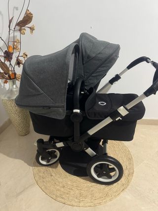 Carrito de bebé Bugaboo Donkey3 , compuesto por : Chasis plata ( leves señales de uso ) 1 capazo ( opcional un segundo capazo ) 2 sillas ( 1 de ellas nueva a estrenar de Donkey 5 ) Capotas nuevas ( sin etiquetas) extensibles con ventanita de ventilación color negro Fundas de manillar y barra nuevas a estrenar Plásticos de lluvia cesta lateral gris cesta inferior nueva a estrenar ruedas macizas todo terreno Es un carro reacondicionado se entrega limpio 🧼 e higienizado .
