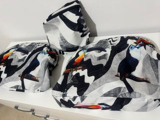 Capotas y cubre cesta para Bugaboo Donkey. El diseño presenta un estampado de tucanes y formas geométricas en blanco y negro. - Estampado de tucanes y formas geométricas. - Diseñado para Bugaboo Donkey.( válidas para cualquier versión Donkey) extensibles