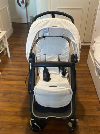 Silla de paseo Bugaboo Bee del año 2015 en color negro. Es ligera y fácil de maniobrar. - Asiento acolchado. - Arnés de seguridad de 5 puntos. - Cesta de compras. - Capota extensible. - Capazo para bebés. - Incluye juego de fundas de invierno. - Incluye funda de silla de verano. Tiene 2 desperfectos que no impiden su funcionalidad: 1. La cesta inferior está enganchada con un alambre ya que el agarre original de tela se partió (ver foto). 2. El mecanismo extensor de la silla está partido en uno de los lados. Durante todos estos años este desperfecto no ha supuesto ningún problema (ver foto).