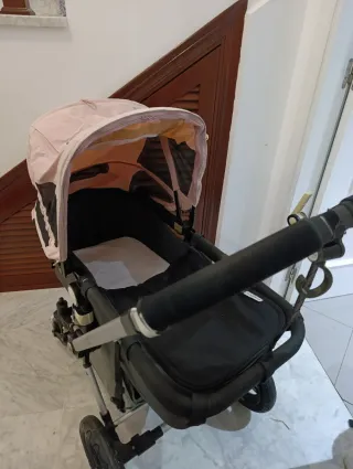 Carro Bugaboo en color negro y gris. Incluye: -Capazo -silla -Patín - Capota rosa de verano con mosquitera - Funda de manillar