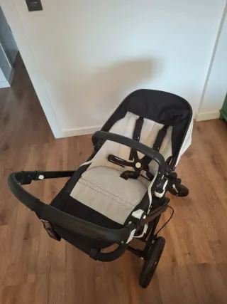 Carro Bugaboo completo en buen estado. - Chasis robusto. - Asiento acolchado con funda a rayas. - Capota extensible. - Arnés de seguridad. - Ruedas todoterreno.