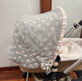 Conjunto de ropa para Bugaboo Camaleon hecho a medida. Es reversible. - Tejido con estampado de topitos grises. - Incluye capota, saco y colchoneta. - Acabados con puntilla y lazos.
