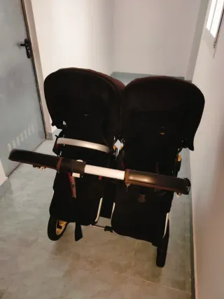 Silla gemelar Bugaboo Donkey en color negro. Ideal para hermanos con poca diferencia de edad o gemelos. - Chasis robusto y ligero. - Asientos reclinables e independientes. - Manillar ajustable en altura. - Cesta de compras espaciosa - Dos capazos - Dos sillas - Adaptador para sillas grupo cero (huevitos) Se puede combinar de varias maneras: 2 capazos, capazo y cesta, dos sillas...Está bastante usada pero funciona perfectamente. Se regala una sombrilla azul y otra capota beige y un cubre capazo también beige. Hay una capota que tiene roto uno de los enganches (ver fotos) y falta una barra. Se hace entrega entre Balmaseda y Bilbao