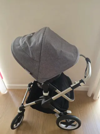 Carro de bebé en color gris, con un diseño moderno y funcional. Marca BUGABOO - Estructura robusta y ligera. - Ruedas todoterreno para mayor maniobrabilidad. - Capazo espacioso y confortable. Incluye colchón, accesorios de paseo, silla, capota de verano y funda impermeable.