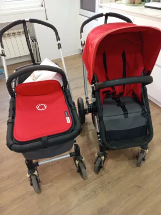 comprado nuevo en tienda (manual y factura) Usado por un solo bebé (poco uso por Pandemia) El único desgaste es la polipiel manillar (habitual en Bugaboo) y ha bajado algo de color en la capota roja. Viene con capazo y silla Bugaboo. Incluye/ se regala: - 2 sacos: uno marca Rosy Fuentes(60€)y otro Walking Moon(70€) -Plástico lluvia Bugaboo - Sombrilla (60€)a juego con la capota azul. con su caja Bugaboo - Bolso marca Cosamui(50€) - 2 capotas Bugaboo: invierno (roja) y azul ventilada verano (100€) - 2 ganchos manillar para colgar bolsas etc. Todo el lote nuevo costò 1.150€ Se envia en su caja o se puede ver en persona en Asturias