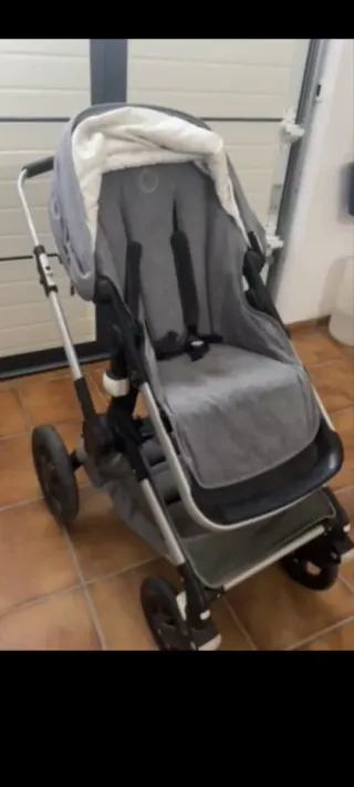 Carro de bebé Bugaboo en color gris. Ideal para paseos cómodos. - Estructura metálica. - Arnés de seguridad de 5 puntos. - Barra frontal acolchada. Capota extensible sin estrenar, por ponerle una celeste a juego con las vestiduras en muy buen estado, el capazo se usó tan solo 2 meses en la barra tiene unas fundas protectoras por tener un poco despellejado, por lo demás está muy bien