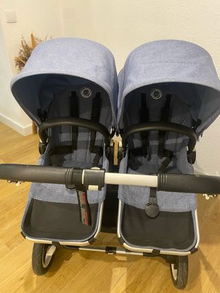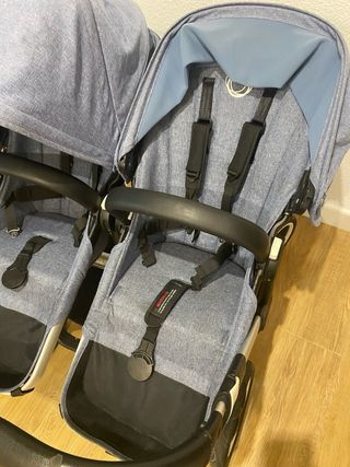 Carro gemelar Bugaboo en color gris, perfecto para dos niños. - Diseño moderno y funcional. - Capotas amplias para mayor protección. - Arnés de seguridad de 5 puntos.