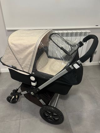 Carro Bugaboo en color beige y negro. - Capazo amplio y cómodo. - Capota extensible. - Ruedas todoterreno.