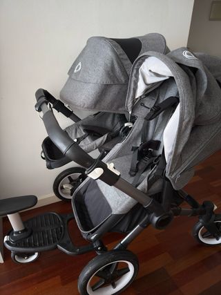 Cochecito gemelar Bugaboo Donkey 5 en color gris. Está en buen estado y listo para usar. - Perfecto para gemelos o mellizos + hermano mayor - Incluye: - 2 sillitas de paseo con dos capotas. - 1 Capazo bebé recién nacido. - Patinete hermano mayor - plástico lluvia - Cesta lateral - Dispone de barra de apoyo. - Se pliega fácilmente. - Ruedas resistentes. tiene una abrazadera rota, he subido la foto que lo enseña. pero se puede conseguir.