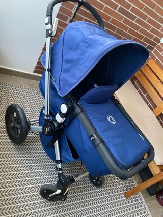 Cochecito y sillita de paseo de bebé. Marca: Bugaboo Camaleon Color: azul y negro. - Carrito con capazo y silla. - Capota extensible. - Ruedas todoterreno. - Con burbuja para la lluvia. En perfectas condiciones. Costó más de 1.200 eur.