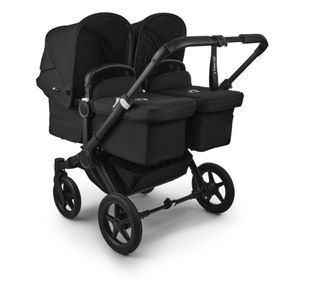 Carro gemelar Bugaboo en color negro. Perfecto para dos niños. - Chasis robusto. - Dos capotas negras -Asientos cómodos. - cesta - forro de lluvia - dos capotas azules - capazo