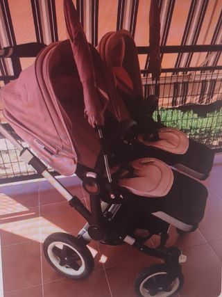 Vendo cochecito gemelar Bugaboo Donkey 3 en color rojo. Está en muy buen estado y listo para usar. - Perfecto para gemelos o mellizos. - Diseño compacto y fácil de maniobrar. - Capota extensible para proteger del sol. - Incluye: - Dos sillas - Dos capazos - Bolsa para transporte cuando el carro se pone en modo individual - Dos capotas rojas, en buen estado, pero tienen el plástico de los lados rotos (solo es estetico) - Plásticos para la lluvia sin estrenar Los rozones tipicos de uso, pero en muy buen estado Dispongo de sacos de invierno, colchonetas de verano y cubrecamas blancos. Preguntar sin compromiso