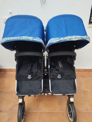 Silla de paseo doble Bugaboo Donkey en color negro y beige. Perfecta para dos niños. - Capotas extensibles. - Arnés de seguridad de 5 puntos. - Cesta de compras. - Ruedas todoterreno. Se vende además con dos capotas en color azul con cubrepies, protector para la lluvia, dos capazos y cesta auxiliar (se coloca en el lugar de una segunda silla). Se entrega también con 2 fundas de capazo, dos empapadores para el colchón del capazo y sábanas