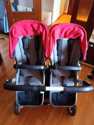 Carro gemelar Bugaboo Donkey 3 en color gris y capotas rojas. - Chasis robusto y ligero. - Dos asientos cómodos. - Capotas extensibles para mayor protección. - Cesta de compras lateral. Se puede ver sin compromiso.