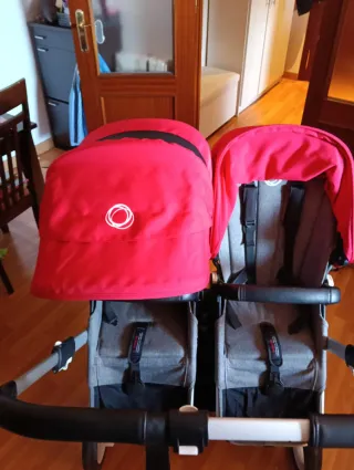 Carro gemelar Bugaboo Donkey 5 en color negro con capotas rojas amanecer. Comprado en noviembre de 2023 solo 1 año de uso lleva 1 año guardado. Disponible sus cajas originales. - Chasis negro. - Dos capotas extensibles en color rojo amanecer. - Asientos negros. - Ruedas negras. 2 capazos y 2 sillas con cesta y plástico de lluvia nuevo a estrenar, se entrega con vestiduras de capazo blancas y colchitas y 2 bolsos que se muestran en la foto y un neceser grande blanco todo hecho a mano y medida. También se entrega 2 piezas nuevas de las capotas que se pidieron a estrenar y fundas de manillar nueva en su caja. Se puede ver sin comprom