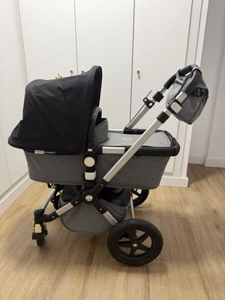 Cochecito Bugaboo Camaleón 3 en color gris con capota negra. Incluye varios accesorios originales para mayor comodidad, bolso, protector de lluvia y colchoneta. - Chasis ligero y maniobrable. - Capota extensible para protección solar. - Cesta de almacenamiento inferior. - Ruedas todoterreno.