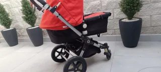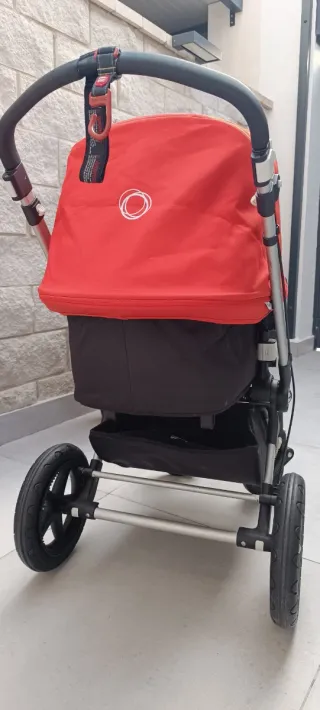 Carrito de bebé Bugaboo con capota en color rojo. - Estructura metálica. - Ruedas todoterreno. - Asa ergonómica. -Contiene carrito bebé hasta la silla (capazo) - Otra capota color azul sin estrenar - Plástico para la lluvia -Incluye funda para el invierno