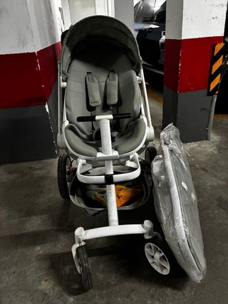 Carrito de bebé Stokke Xplory X en color gris. Un cochecito elegante y funcional. - Chasis de color gris. - Asiento ergonómico. - Capota ajustable. - Arnés de seguridad de 5 puntos. Doy con el capazo en su caja, con funda anti mosquito y anti lluvia.