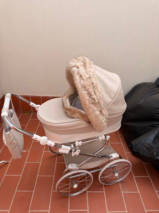 Carro de bebé en color rosa de polipiel con un diseño elegante y moderno. La capota cuenta con un suave y cálido acabado de pelo sintético. - Capota con detalle de pelo. - Interior acolchado. - Estructura resistente. -con caja original
