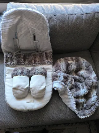 Conjunto de paseo para silla de coche, compuesto por saco, capota, bolso y neceser. El diseño es en color blanco roto con pequeños topos grises. - Saco de silla con interior suave. - Capota a juego con interior suave. - Bolso espacioso(asas un poco peladas,adjunto foto) - Neceser a juego.