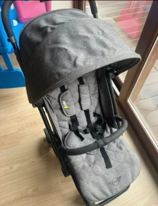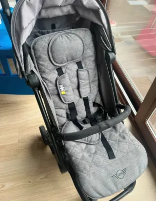 Silla de paseo en color gris, con detalles acolchados y el logo de Mini. - Capota extensible. - Arnés de seguridad de 5 puntos. - Barra delantera. - Ruedas todoterreno.