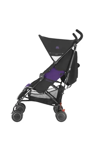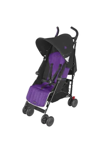 Silla NUEVA Maclaren Quest negro y morada. Conocida por ligera, resistente y de plegado compacto tipo paraguas. Facilita su transporte y almacenamiento. Desde el nacimiento hasta aprox 25 kg de peso. Respaldo acolchado reclinable en 4 posiciones, que puede llegar a una posición completamente plana. Incluye arnés de protección de 5 puntos ajustable y detalles reflectantes para visibilidad nocturna. Extras: capota extensible e impermeable