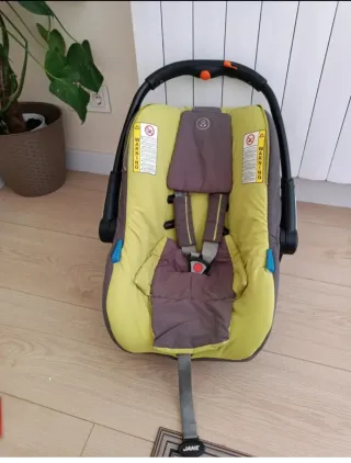 Silla de coche para bebé de la marca Jane, en color verde lima y gris. - Asa de transporte. - Arnés de seguridad de 5 puntos. - Capota integrada.