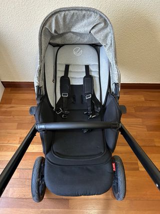 Sillita de paseo de la marca Jane, incluye capazo. - Color negro y gris. - Arnés de seguridad de 5 puntos. - Capota. - Reposapiés. - Ruedas delanteras giratorias.