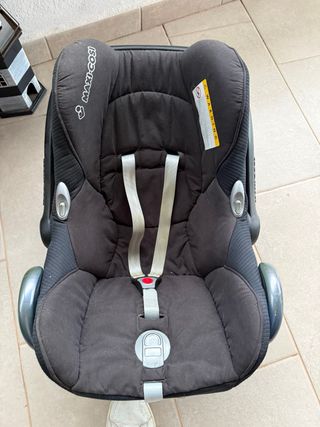 Silla de coche Maxi-Cosi para bebé, ideal para los primeros viajes. - Color gris. - Incluye capota. - Asa de transporte. - Sistema de anclaje seguro.
