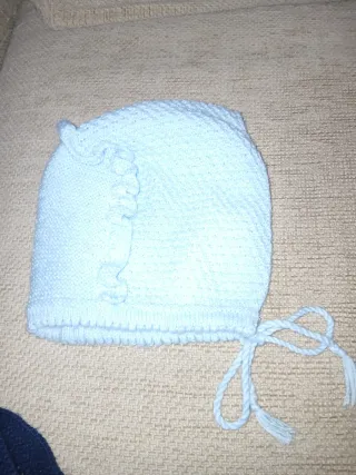 Para niña 0-3 meses, conjunto de 3 piezas hecho a mano (por mí): faldón, capota y patucos en lana y piqué rosa con lunares (topos) blancos. Nuevo, sin estrenar. **Los precios no son negociables,** me ha llevado muchas horas de trabajo.