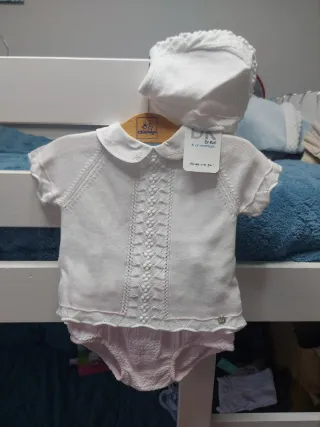 Conjunto de ropa para bebé compuesto por vestido y capota, ideal para 3-6 meses. - Vestido blanco con detalles dorados y lunares. - Capota a juego con volante. Haz lote con 2 prendas o más y tienes descuento. Revisa mi armario, amplia oferta de ropa de niña de todas las tallas. Envíos rápidos y protegidos.