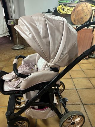 Carro de bebé en tonos rosa y gris, ideal para paseos. - Capota amplia. - Asiento acolchado. -Tres posiciones. -Se hace capazo. -Se hace silla -Se puede cambiar de posición mirando para ti o para la calle. - Ruedas resistentes.