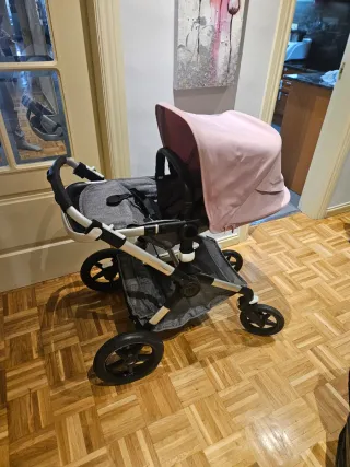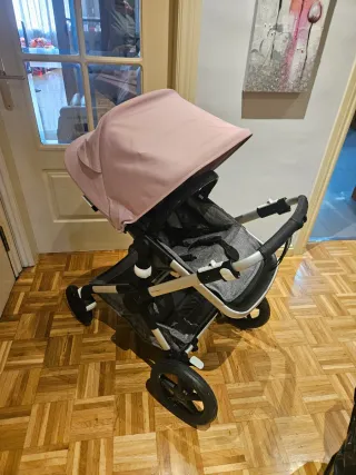 Cochecito Bugaboo en color rosa, ideal para paseos cómodos. - Capota extensible. - Asiento reclinable. - Ruedas todoterreno - protector de lluvia - barra en muy buenas condiciones. No esta pelado Funda limpia recientemente Tiene unas pequenitas manchas en la capota son muy discretas. Pero ver las fotos.