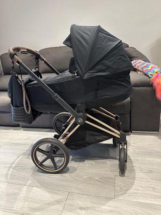 Cochecito Cybex Platinum Priam en acabado Gold Rose. Un diseño elegante y funcional. - Chasis en color Gold Rose. - Capazo y silla en color negro. - Capota extensible. - Manillar y barra de seguridad con detalles en polipiel. - Bolsa de cochecito cybex - Asiento reversible. - Capazo y silla con ventilación para verano. - Capota solar UPF 50+. - Suspensión integral en todas las ruedas. - Arnés con sistema ONE PULL. #cybexpriam #carritobebe #cochecitobebe #rosegold #ofertacarrobebe