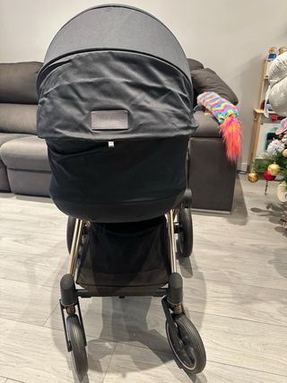 Silla de paseo Cybex Mios Platinum en color negro con detalles en oro rosa. - Chasis en oro rosa. - Asiento reversible. - Capota extensible. - Incluyo el plástico para la lluvia.