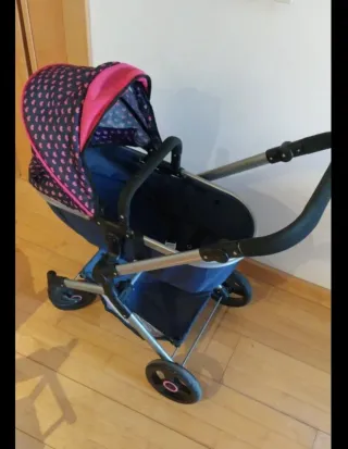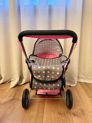 Carrito de muñecas en color rosa con un bonito estampado de estrellas grises y blancas. Se encuentra en perfecto estado, casi nuevo y con muy poco uso. - Estructura principal en color rosa. - Capazo con capota. - Incluye bolso a juego.