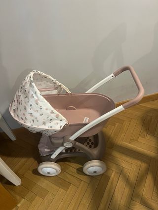 Carro de muñecas con un alegre estampado floral y detalles en rosa. - Estructura metálica. - Capota ajustable. - Barra de seguridad. - Arnés de sujeción. - Nunca a salido a la calle precio de compra 80€ Toysrus