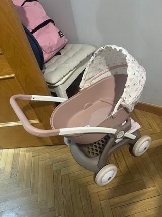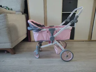 Carrito de juguete color rosa y detalles en gris. Funciona bien y las telas y ruedas están en buen estado. Le falta una espuma que tenía en la empuñadura que estaba muy gastada y una tela que iba con cremallera y cerraba el capazo. Los remaches de la capota habría que apretarlos o cambiarlos porque se mantiene abierta si está en vertical pero no a media altura.
