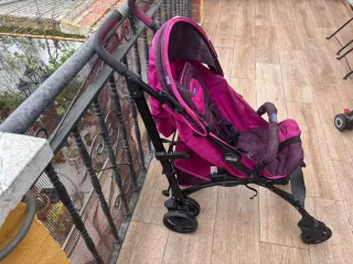 Cochecito ligero y práctico, ideal para paseos. - Color rosa y gris. - Capota. - Arnés de seguridad. - se desarma para llevar en el automovil -se uso 2 dias en disney francia desde entonces esta guardado el precio nuevo fue 50 tiene 2 dias de uso el precio es de 30 esta muy bien para libersrte del peso de tu bebe