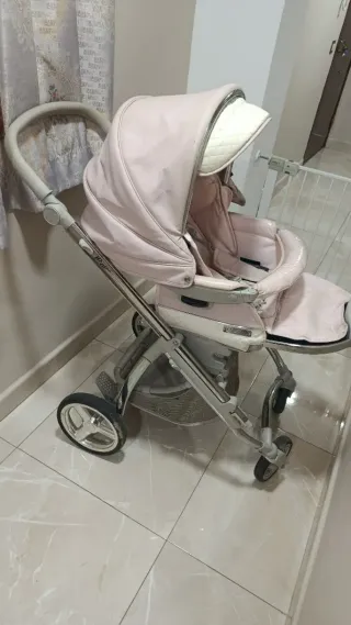 Elegante carro de bebé en color rosa con detalles dorados. - Capazo espacioso y cómodo. - Capota ajustable. - Ruedas con llantas doradas. - Cesta inferior de almacenamiento. Precio negociable Tambien tiene bolso