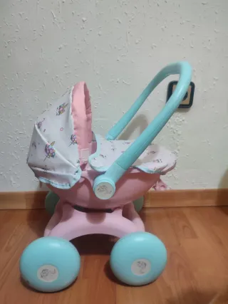 Coche de capota para muñecos, ideal para jugar. Le fala el enganche de la capota del lado derecho, por lo demás está impecable - Diseño con capota. - Interior con estampado de estrellas y detalles en rosa. - Cesta inferior de rejilla. - Ruedas con detalles en rosa.