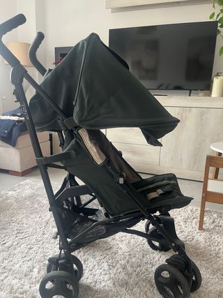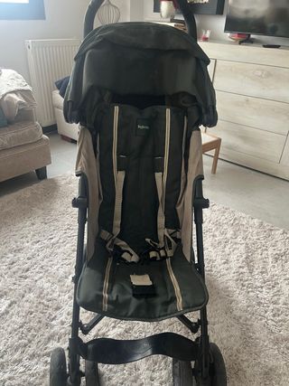 Silla de paseo Inglesina modelo Trip, ideal para llevar a los más pequeños cómodamente. - Color verde y beige. - Arnés de seguridad. - Capota. - Ruedas delanteras giratorias. - Se pliega estilo paraguas. - Tiene plástico para la lluvia que nunca se ha usado