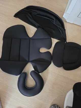Conjunto de accesorios para silla de coche de bebé, todo en color negro. Hasta 7 años. O 13kg. Para autos con o sin isofix. - Cojín reductor principal con múltiples formas. - Cojín adicional para la cabeza. - Capota protectora. - Cojín lateral.
