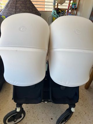 Carro doble para hermanos seguidos. Compuesto por un capazo y dos sillas. capotas extensibles color beige. En muy buen estado. El chasis tiene algún rasguño, pero apenas se aprecia. Las ruedas están impecables, van de maravilla. Una de las barreras de la silla tiene una funda de polipiel, igual que en el manillar, también de polipiel. Incluye la cesta con cubre por si se utiliza el carro individual. También tengo los dos plásticos para la lluvia.